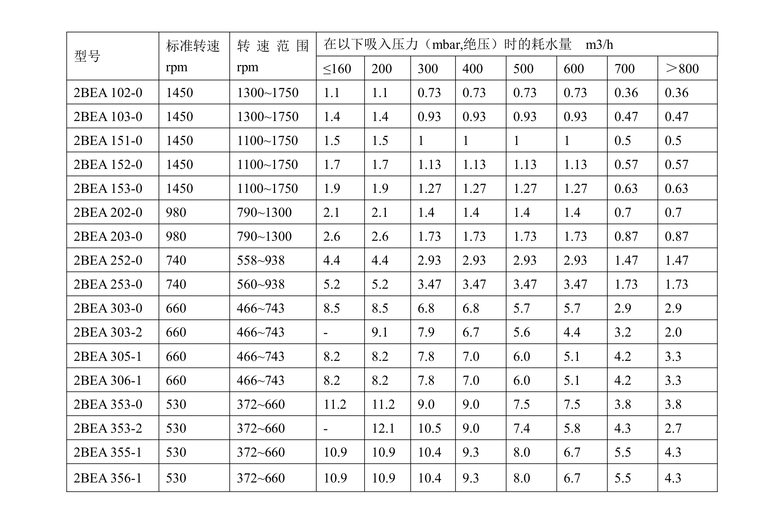 型號(hào) | 標(biāo)準(zhǔn)轉(zhuǎn)速 rpm | 轉(zhuǎn)速范圍 rpm | 在以下吸入壓力(mbar,絕壓)時(shí)的耗水量 m3/h | |||||||