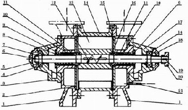 1.端蓋2.排氣園盤3.后軸承架4.軸承5.后軸承城市蓋6.軸7.園螺母8.后軸套9.填料壓蓋10.填料壓圈11.填料12.平鍵13.葉輪14.泵體15.吸氣園盤16.前軸套17.前軸承架18.前軸承壓蓋19.平鍵20.聯(lián)軸器21.進(jìn)水管