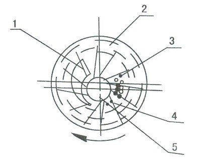 1、吸氣口 | 2、水環(huán) | 3、排氣閥 | 4、排氣口 | 5、葉輪 |